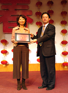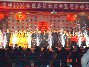 | 春節(jié)前夕,山大南校區(qū)主樓報(bào)告廳內(nèi)喜氣洋洋、掌聲陣陣,山大華特 2006 年度總結(jié)表彰會(huì)暨迎新春文藝演出正在這里隆重舉行,駐濟(jì)南各公司的全體干部員工和外地公司的高管及演員和先進(jìn)代表共三百多人參加了本次會(huì)議。會(huì)議對公司 2006 年度的明星企業(yè)、先進(jìn)集體及先進(jìn)個(gè)人進(jìn)行了表彰,并用 2 個(gè)多小時(shí)的時(shí)間,演出了公司員工自編自導(dǎo)自演的 17 個(gè)節(jié)目,歌頌了山大華特在上市五年多來特別是過去的一年里取得的成績,抒發(fā)了對公司美好未來的暢想。山東大學(xué)副校長張永兵先生、校長助理賈磊先生、工會(huì)常務(wù)副主席韓鋒先生及部分處(部)領(lǐng)導(dǎo),山大產(chǎn)業(yè)集團(tuán)、兄弟單位山大魯能、山大華天、山大地緯、學(xué)術(shù)交流中心、環(huán)保水業(yè)的主要領(lǐng)導(dǎo)以及公司董事、監(jiān)事和部分公司客戶也到會(huì)祝賀并觀看了文藝演出。 公司總裁 朱海群 先生作了簡短的公司 2006 年度工作總結(jié),對公司 2006 年的總體工作進(jìn)行了簡要回顧,對各經(jīng)營單元的工作進(jìn)行了點(diǎn)評。 |  張永兵副校長給明星企業(yè)頒獎(jiǎng)