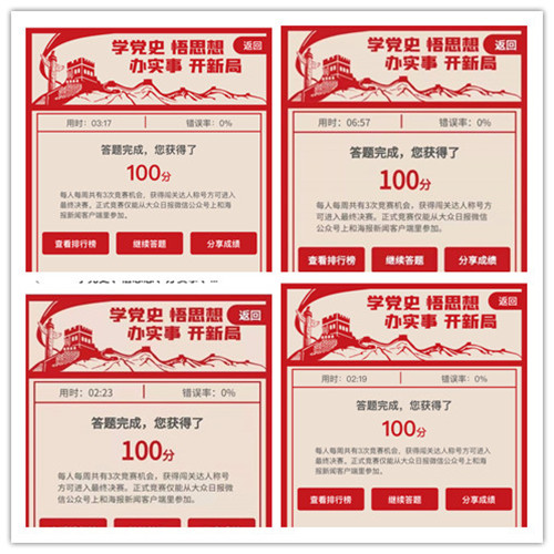通知發(fā)布后,公司黨員、積極分子認真參與,通過下載“海報新聞”客戶端、關注“大眾日報”微信公眾號等方式進行答題,充分運用黨史學習教育自主學習、集中學習、專題學習的學習成果,通過競賽方式查漏補缺,檢驗自身學習效果,提高了自己的黨史知識儲備和黨性修養(yǎng)。公司廣大職工群眾積極踴躍參賽,通過競賽答題增強了學習黨史的興趣,加深了對黨的歷史的認識和了解,從黨的百年奮斗歷程中感悟到黨的一系列光榮傳統(tǒng)和優(yōu)良作風,更加堅定了作為國企職工感黨恩、聽黨話、跟黨走的信念。 三、跟蹤了解參賽情況,加強監(jiān)督 為充分利用此次競賽活動的契機,推動黨史學習教育扎實開展,更加有效地促進公司黨員干部職工以賽促學、融會貫通,黨支部每周動態(tài)了解大家的參賽情況,參賽人員不定期發(fā)送個人答題成績截圖,由黨支部每周進行統(tǒng)計匯總,了解大家的競賽學習狀況,確保真學真用。
